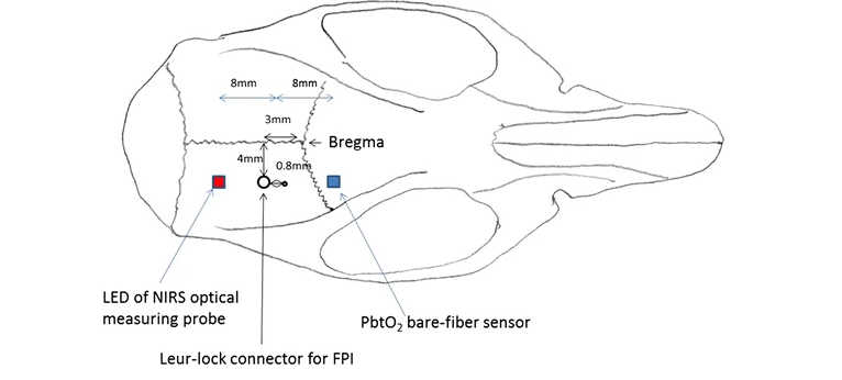 좌표 값을 입력해주면 된다. 해당 좌표값은 bregma를 기준으로 한다. Bregma는 다음 위치를 의미한다. 쥐의 눈꼬리가 끝나는 지점부터 뒤로 2cm 정도 절개해주면 확인할 수 있다.