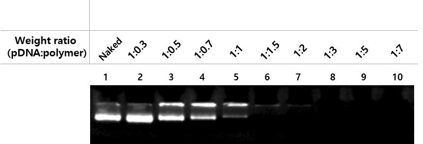 Naked 유전자의 경우 저항 없이 gel을 통과한다. 하지만 Polymer의 양을 늘려가면서 점점 well에서 벗어나지 못하게 되고 1:1.5 비율부터는 아예 retardation이 되었다. 또한 비율이 점점 늘어감에 따라 well에서조차 band가 보이지 않게 되는데 이는 complex가 더 condensation 되면서 masking 되기 때문이다.